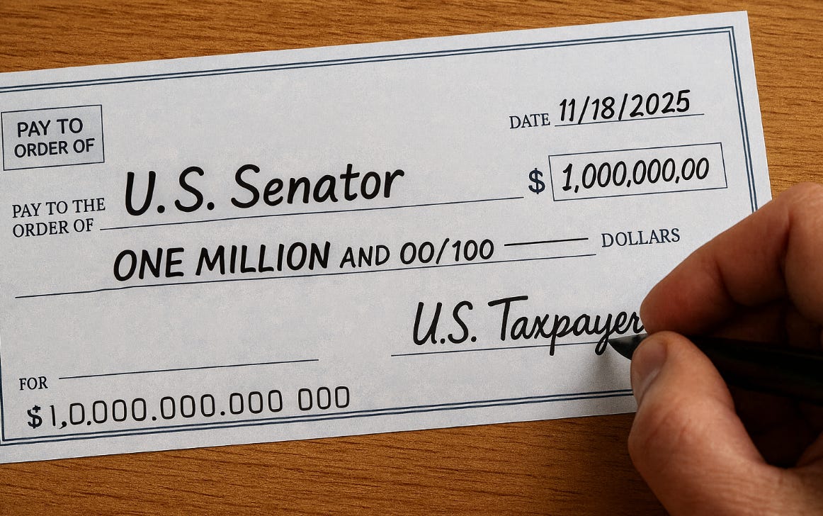 While Americans endured the longest government shutdown in U.S. history, someone slipped a provision into the emergency funding bill that could send millions of dollars in taxpayer money into the personal bank accounts of eight U.S. senators.